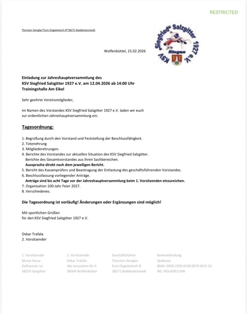 Jahreshauptversammlung am 12.04.2026 ab 14 Uhr Trainingshalle am Eikel